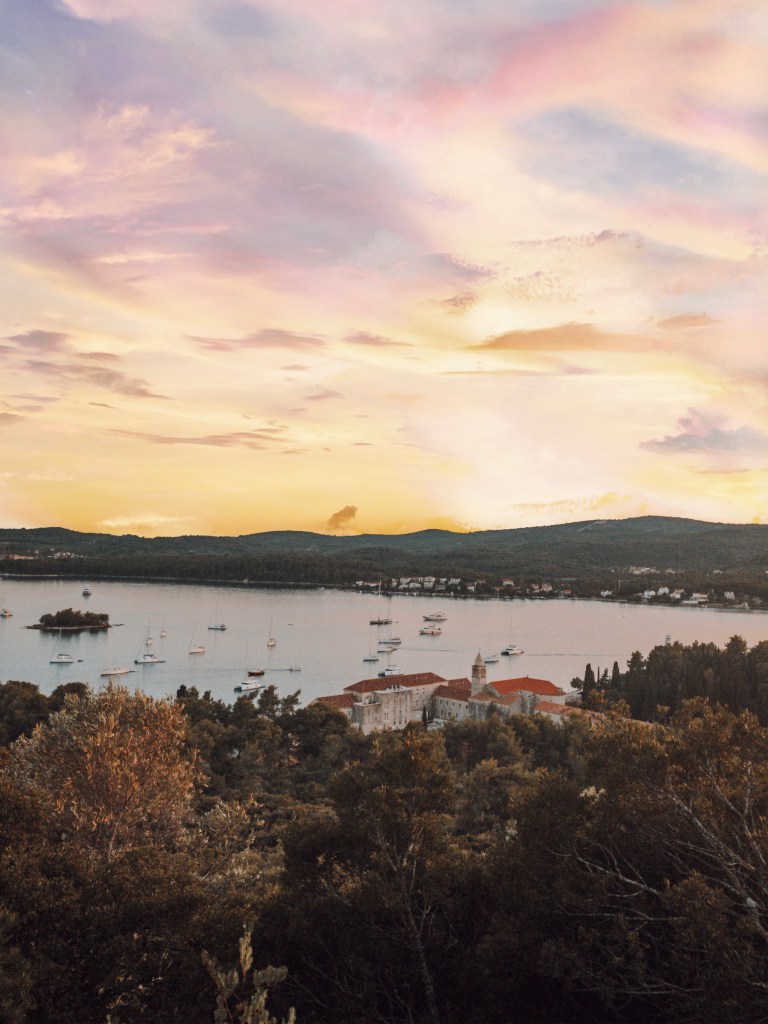 If you find yourself nearby, you should definitely visit this island. During our sailing trip, we moored here for the night. As we were approaching the island we noticed ruins on the top of the hill and a beautiful monastery on the beach. Started to google it, but didnt find anything. So we decided to hop in the byboat and went hiking. Because there is no sign, we took the path behind the monastery, and started climbing up the hill (10min hike). The path has little chapels along the way, with mosaics of Christs crucifixion. This path is leading you to some ruins in forest. Yes, we took the wrong one! On our way down we met some wild deer, and some local showed us the right way. It took us approx. 10 min, to reach the top with great views and church ruins.