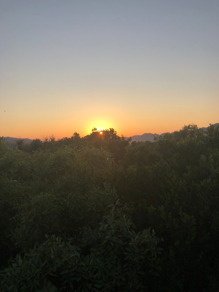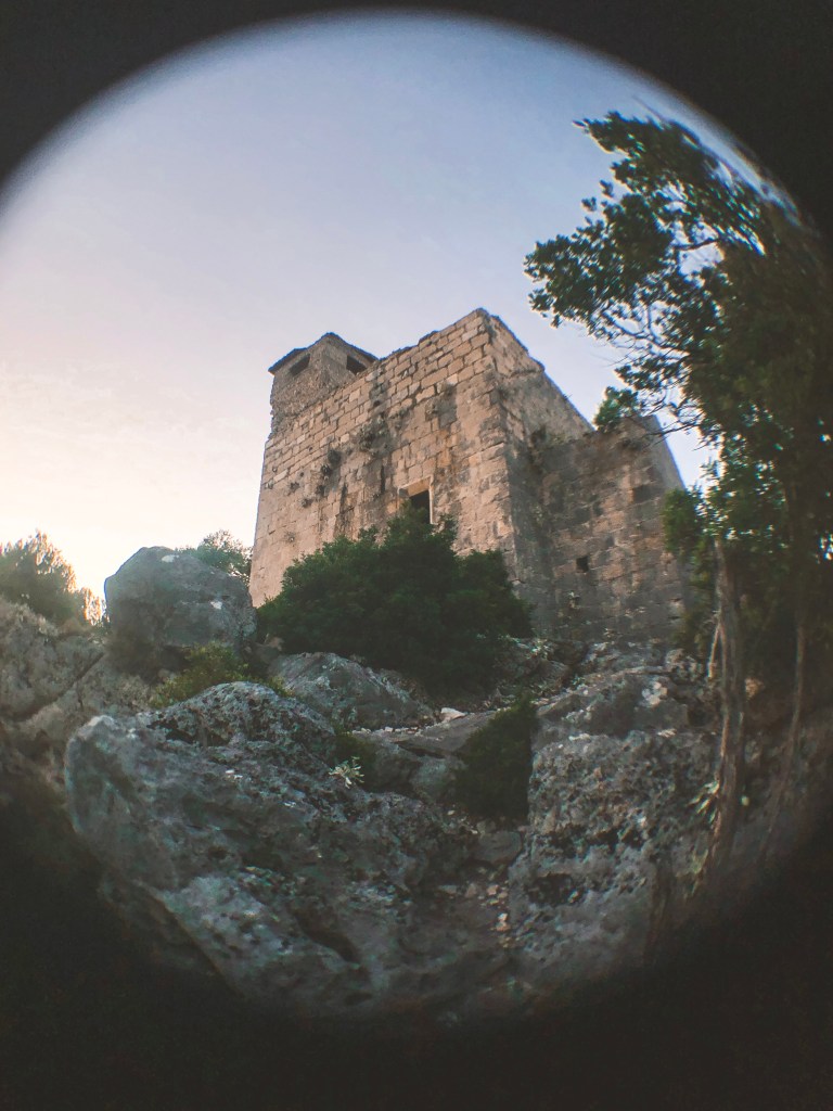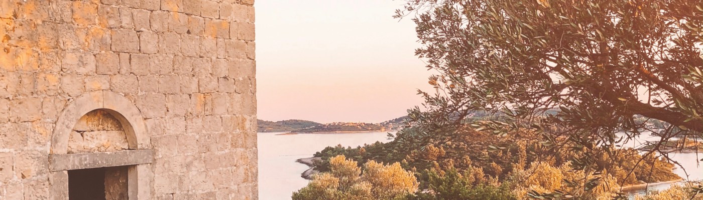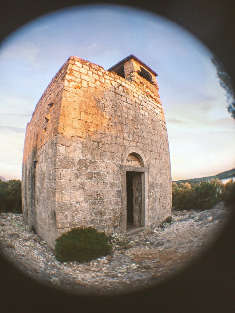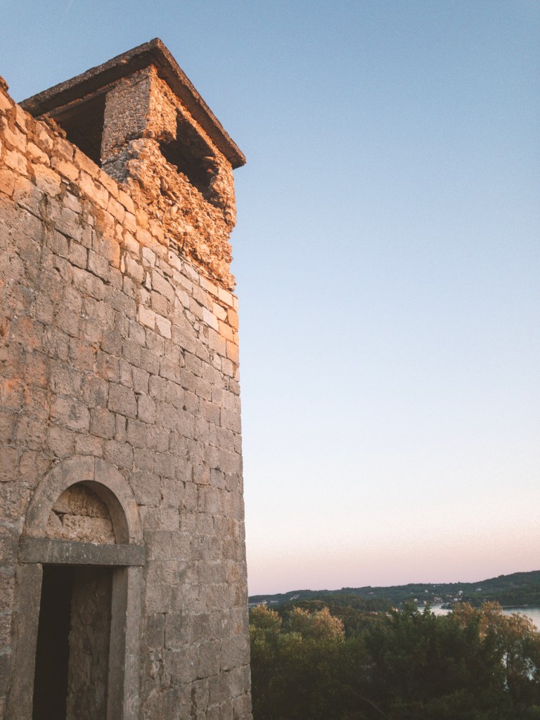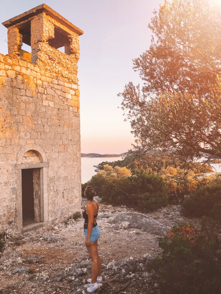 Prijazna domačinka nas napoti v pravo smer. Po ozki potki, ki se vije navzgor skozi gozd borovcev in grmičevja se nam po 10 minutah na vrhu dreves odpre čudovit razgled na celoten zaliv. Sonce že počasi zahaja, in mehki oranžni žarki se odbijajo od morske gladine. Rahlo pihlja in zvok škržatov razbija mir in tišino. Na vrhu hribčka stojijo ruševine cerkvice. Cerkev ima sicer dva nadstropja, a so zunanje stopnice, podrte.