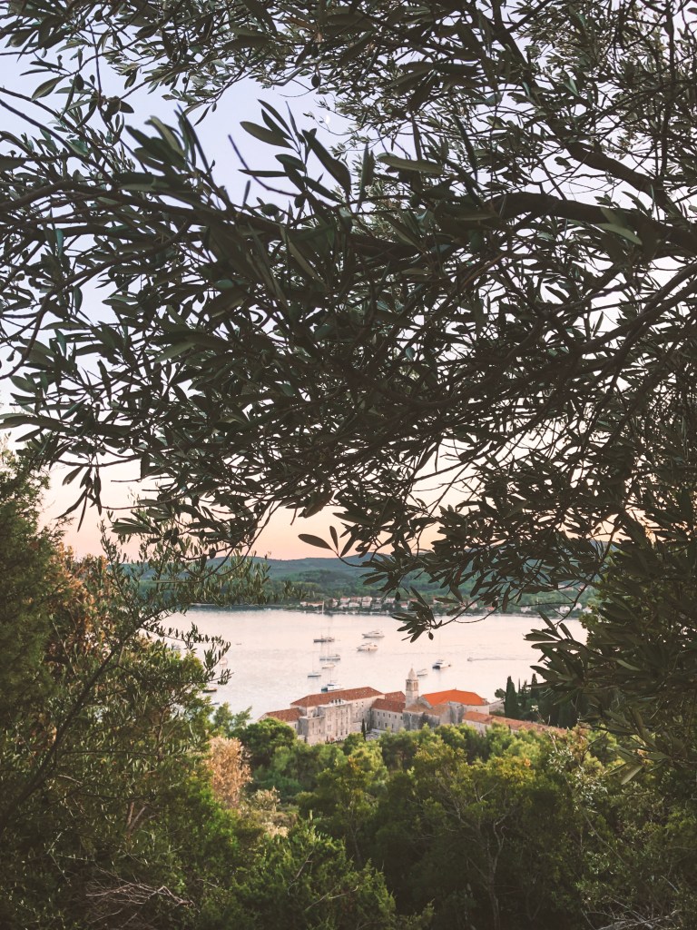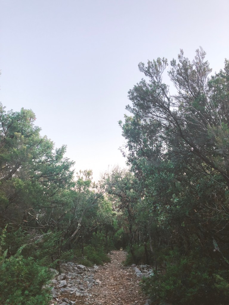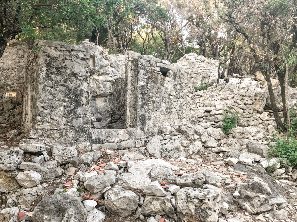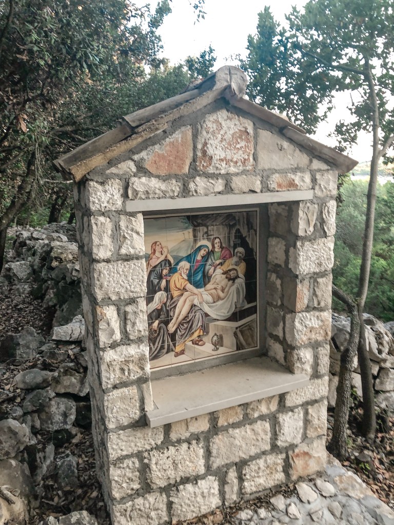 Že takoj, med veslanjem nas je ves čas spremljal pogled na čudovit frančiškanski samostan, ki je bil dokončan okoli leta 1940, sedaj pa je tako samostan, kot tudi okolica ponovno v prenovi. Na otoček je mesto Koručla (leta 1392) naselila frančiškane iz Bosne, in jim s prva poklonila samo zemljišče, kasneje pa cel otok.* Poskakljali smo iz kajiča na obalo in zaman iskali kakšne smerokaze, ki bi nam pokazali pot. Odločilo smo se, da gremo po edini “očitni” kamniti poti, ki se vije za samostanom. Tudi zadnja stran samostana ne razočara – čudovito obzidje, znotraj katerega je nekaj gredic, začimbnic in sadnih dreves. Pot se je počasi vzpenjala, vsake toliko, pa se je poleg nje “pojavila” kapelica, z mozaiki križevega pota. Pot se po kakšnih 15 minutah konča pri ruševinah nedefinirane stavbe.