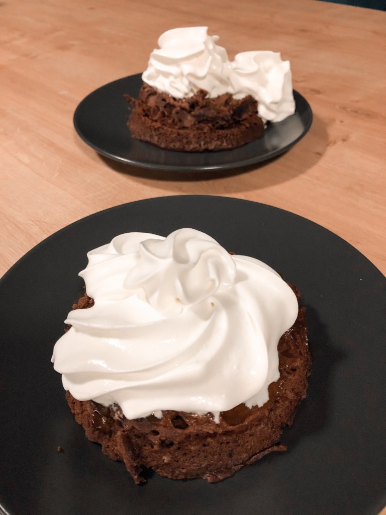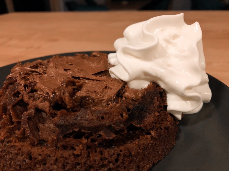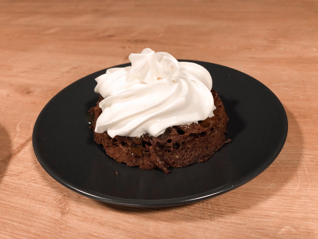 Skodelico postaviš v mikrovalovno in na najvišji temperaturi pečeš cca. 3 min. Pečeno sladico pazljivo vzameš iz mikrovalovne pečice in jo streseš iz skodelice na krožnik. Biskvit prerežeš na pol in na sredini premažeš z marmelado. Polovici ponovno združiš skupaj in po vrhu namažeš nutelo, ter okrasiš s stepeno smetano. Pa dobr tek.
