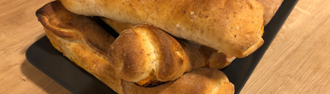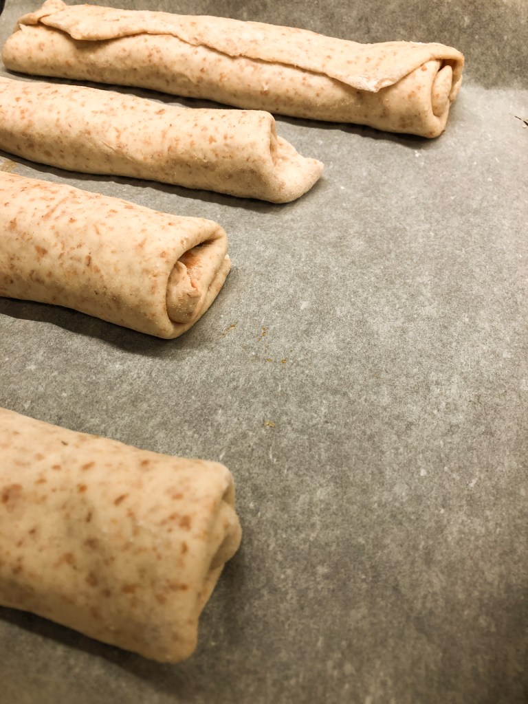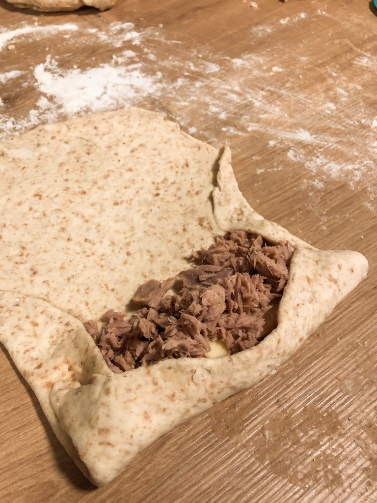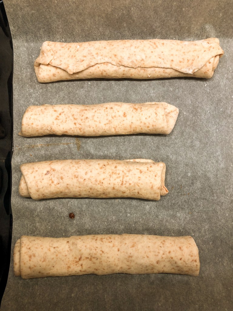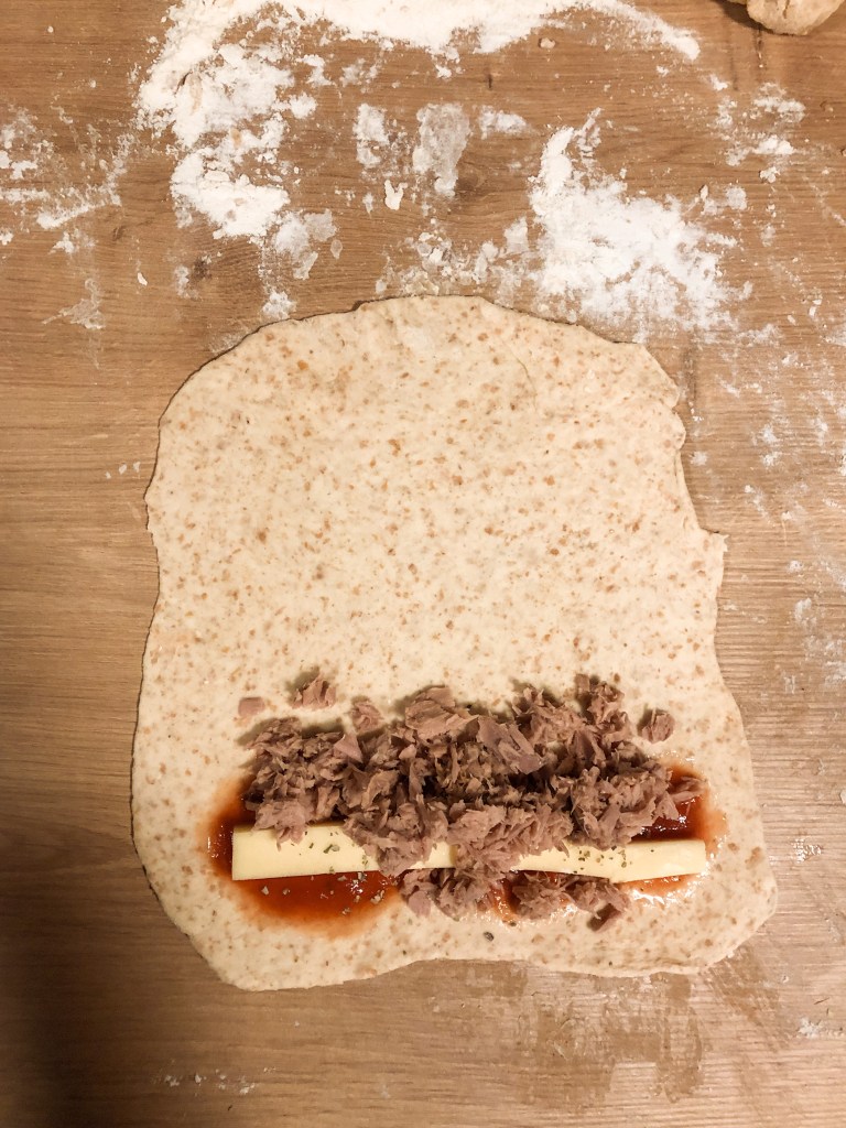 Delovno površino pomokamo. Testo razdelimo na 10-12 delov – odvisno od željene velikosti pica kruhkov. Razdeljene dele oblikujemo v hlabčke in jih enega za drugim razvaljamo v pravokotnik. Spodnjo tretjino pravokotnika namažemo s paradižnikovo omako/mezgo/kečapom. Zunanje robove (cca. 2cm) pustimo prazne. Čez potresemo origano, nadevamo željeni nadev in čisto na konec dodamo sirine palčke. Robove pravokotnika zavihamo proti sredini in testo zvijemo v pica kruhek. Pomembno je, da je kruhek res močno zrolan in robovi dobro zavihani. S tem bomo preprečili, da bi nadev med peko stekel ven. Če se testo na koncu noče sprijeti, si pomagamo z malo vode.