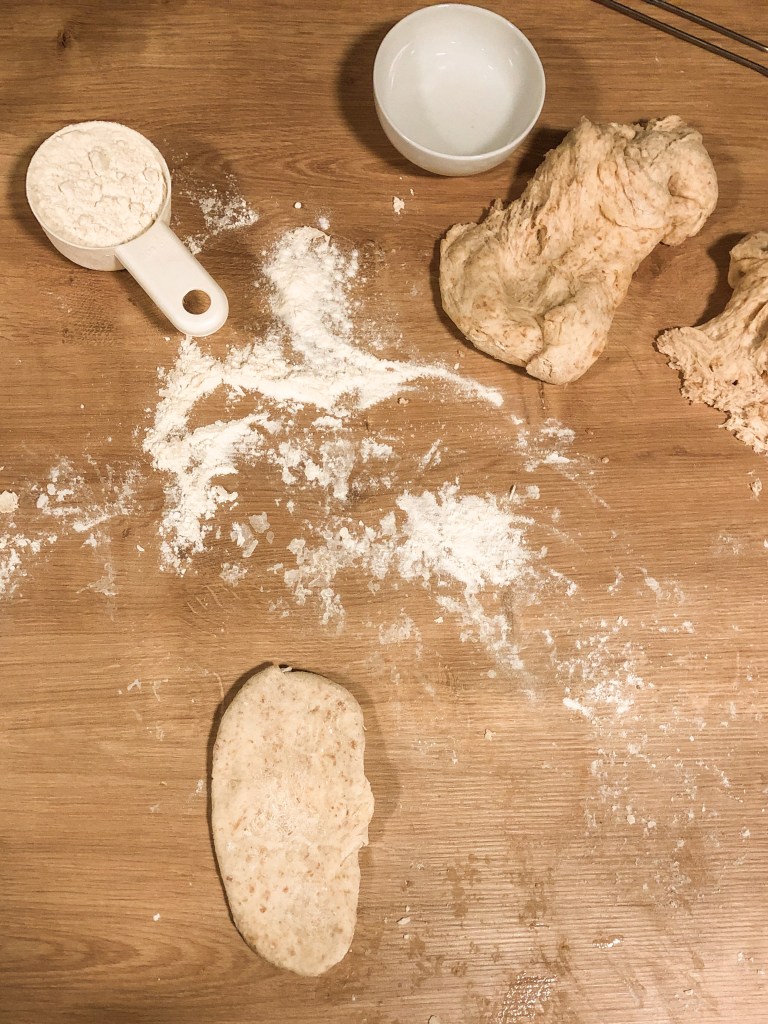 Medtem ko čakamo na kvasni nastavek, odmerimo moko in sol, stresemo v posodo in premešamo. Na sredini naredimo luknjo. Dodamo olje in jogurt. Ko je kvasni nastavek pripravljen, ga postopoma dodajamo mešanici, zraven testo ves čas mešamo z mešalnikom. Testo bo sprva bolj lepljivo, ampak se bo z vzhajanjem vneslo.